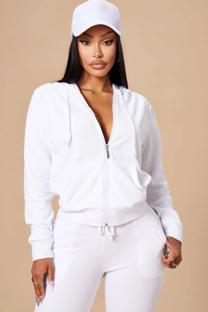 Lounge in style in this stretch velour fabric set. The OG Velour Lounge Set features a zip up hoodie with jogger and ribbed cuffs. Available in black, burgundy, hunter, mauve, navy and white.